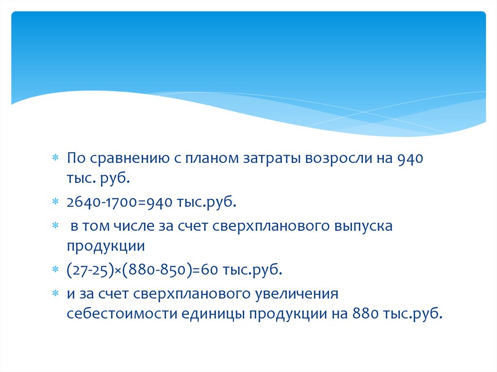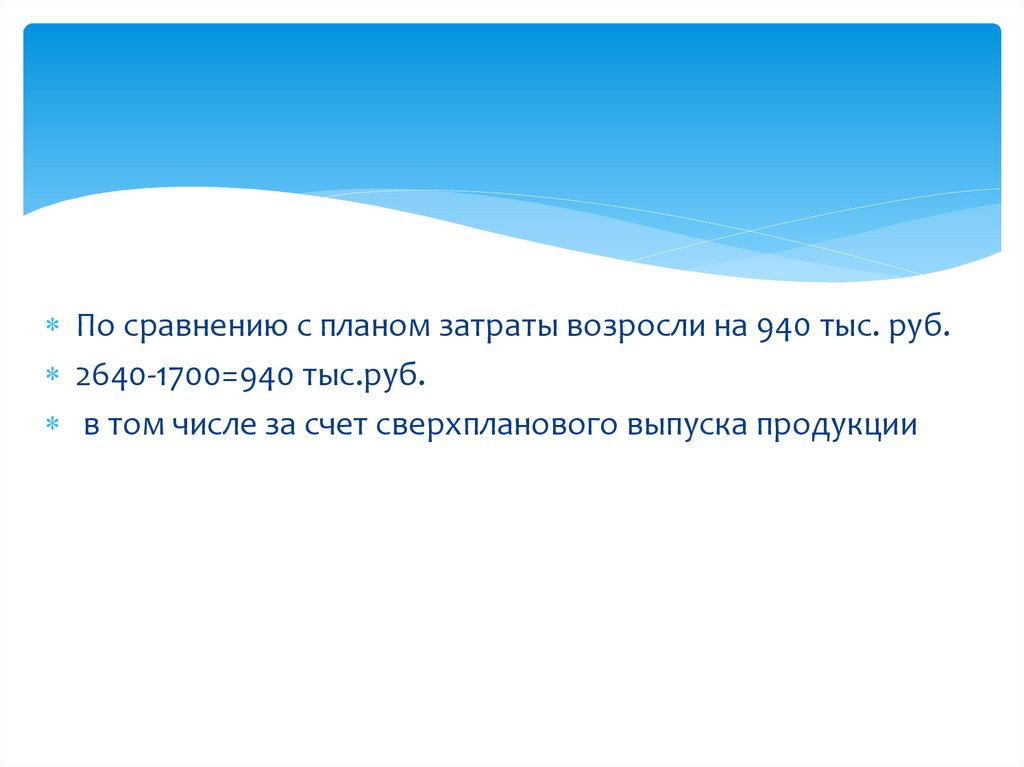 По сравнению с планом затраты возросли на 940 тыс. руб.2640-1700=940 тыс.руб.