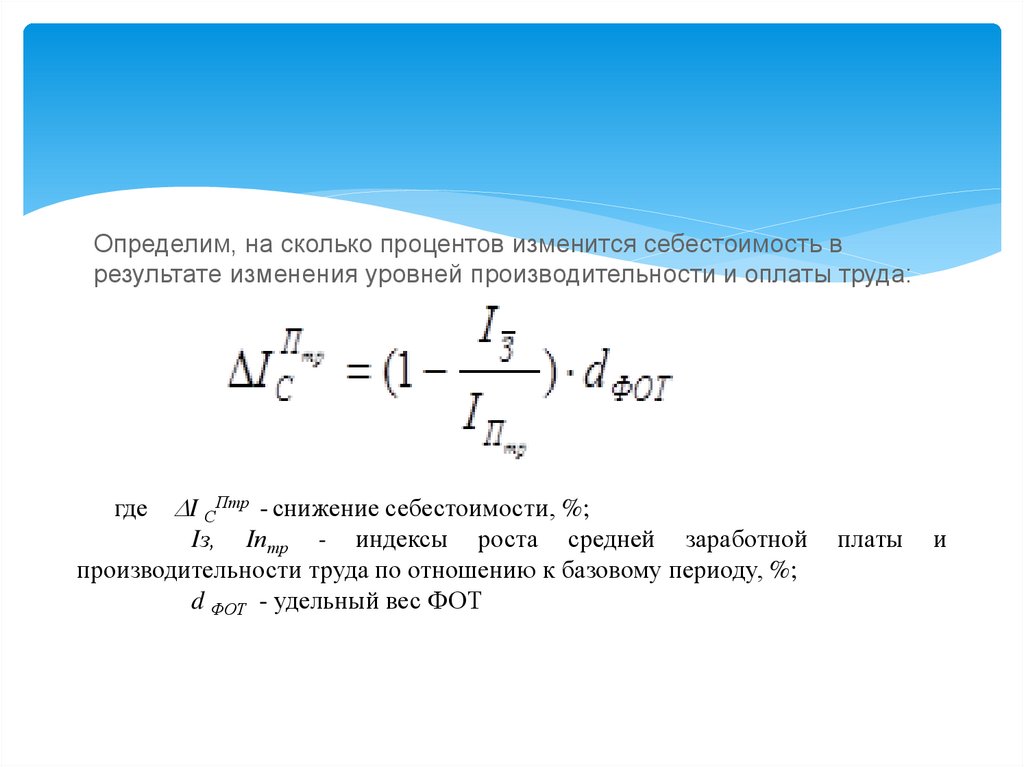Определим, на сколько процентов изменится себестоимость врезультате изменения уровней производительности и оплаты труда: