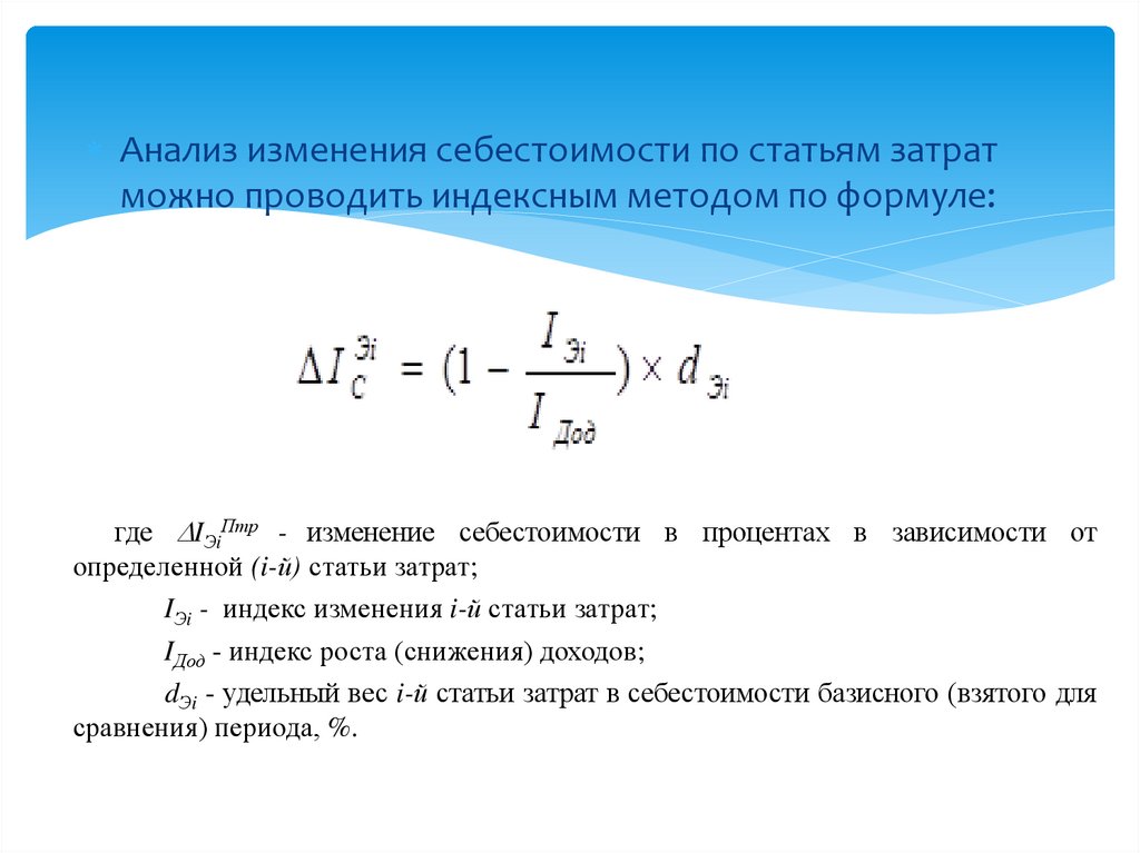 Анализ изменения себестоимости по статьям затратможно проводить индексным методом по формуле:
