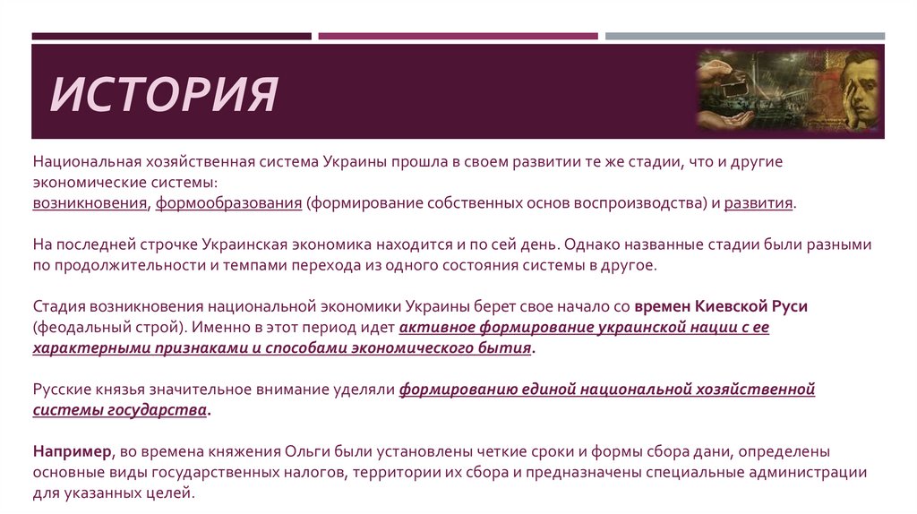 ИСТОРИЯНациональная хозяйственная система Украины прошла в своем развитии те же стадии, что и другие