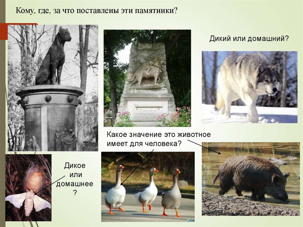Кому, где, за что поставлены эти памятники?Дикий или домашний?