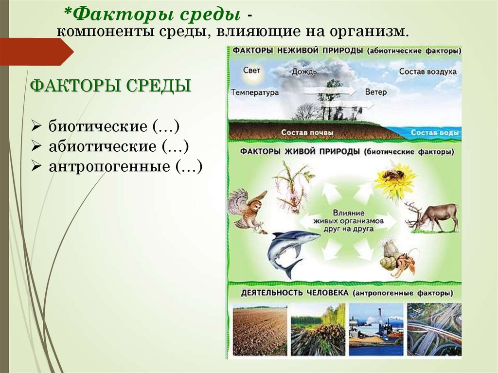 *Факторы среды -компоненты среды, влияющие на организм.