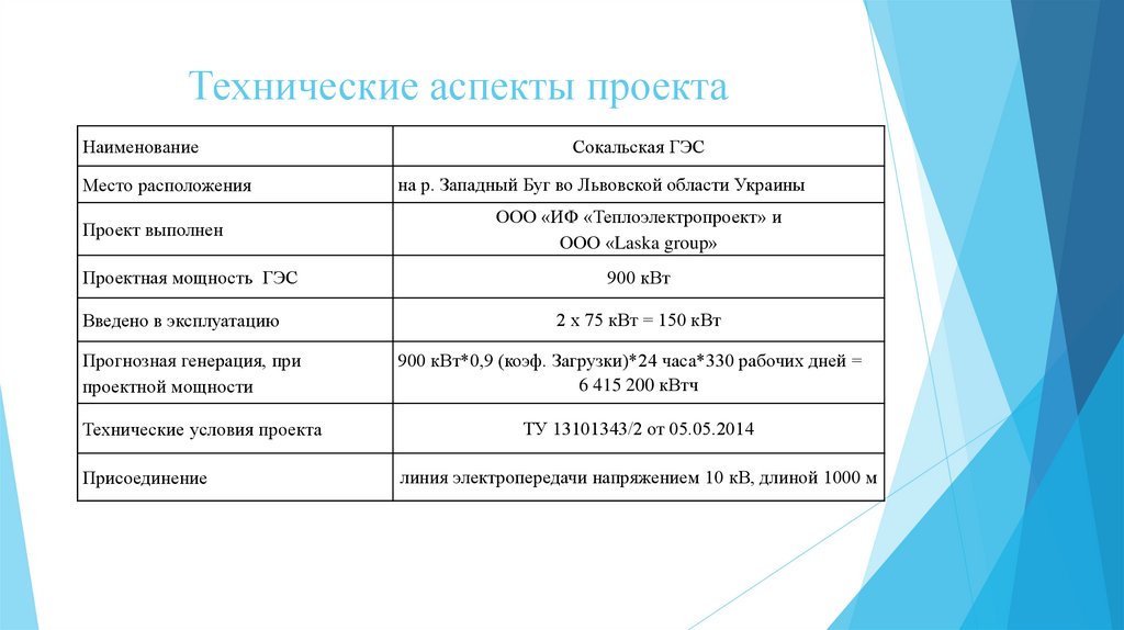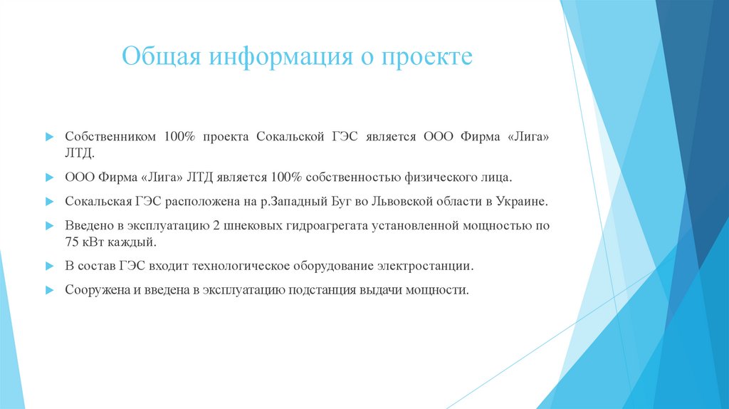 Общая информация о проектеСобственником 100% проекта Сокальской ГЭС является ООО Фирма «Лига»