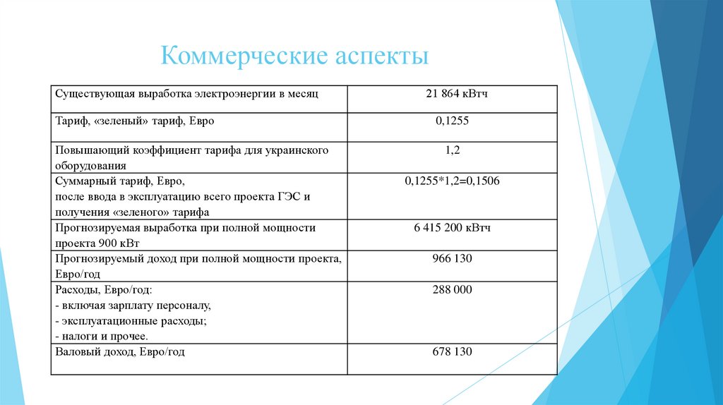 Коммерческие аспектыСуществующая выработка электроэнергии в месяц
