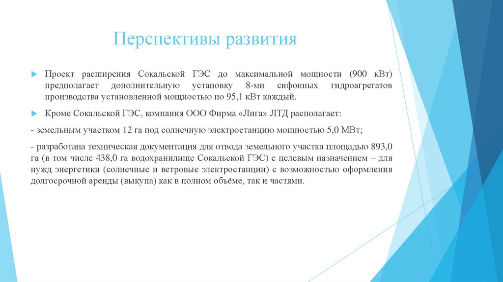 Перспективы развитияПроект расширения Сокальской ГЭС до максимальной мощности (900 кВт)