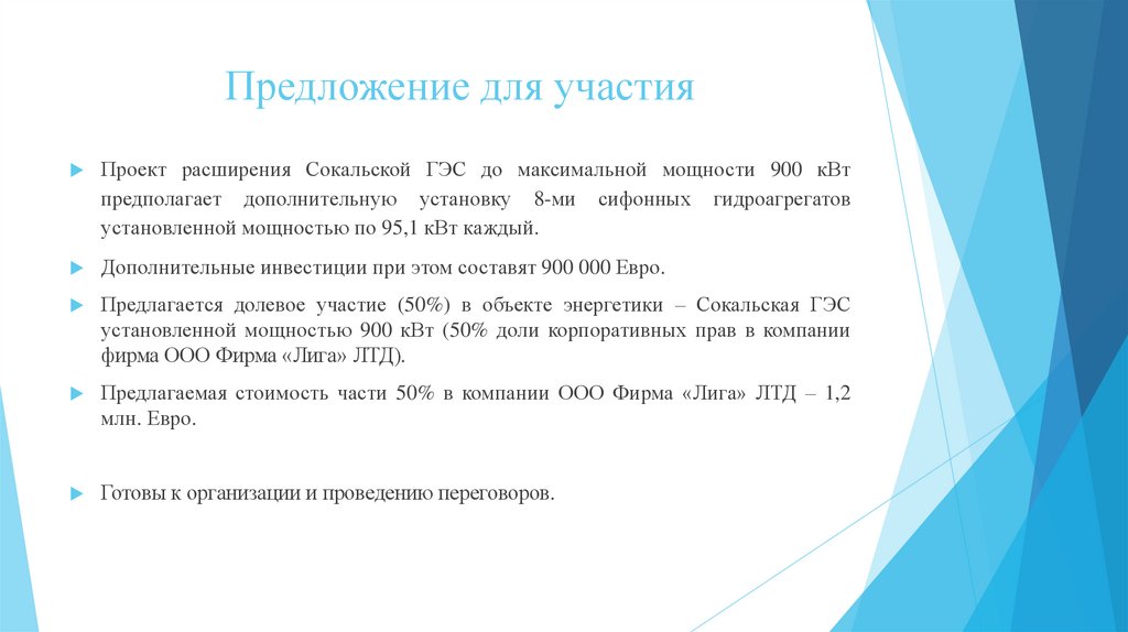 Предлагается долевое участие (50%) в объекте энергетики – Сокальская ГЭС