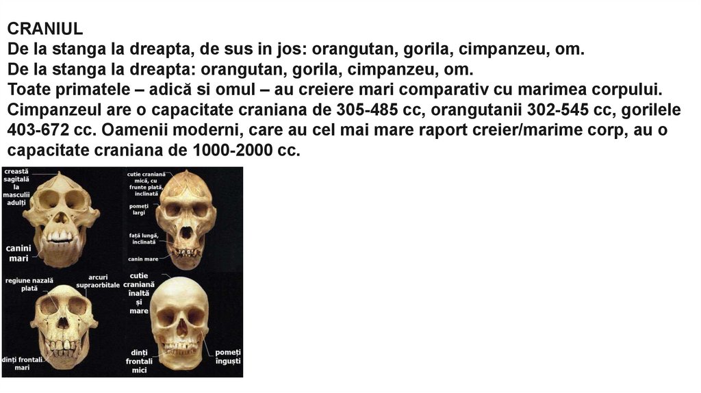 CRANIULDe la stanga la dreapta, de sus in jos: orangutan, gorila, cimpanzeu, om.