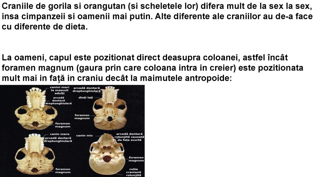 Craniile de gorila si orangutan (si scheletele lor) difera mult de la sex la sex,insa cimpanzeii si oamenii mai putin. Alte diferente ale craniilor au de-a face