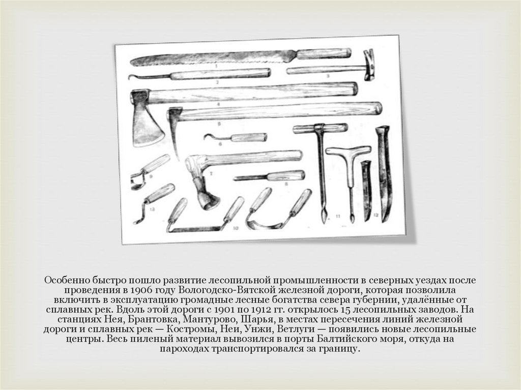 Особенно быстро пошло развитие лесопильной промышленности в северных уездах послепроведения в 1906 году Вологодско-Вятской железной дороги, которая позволила
