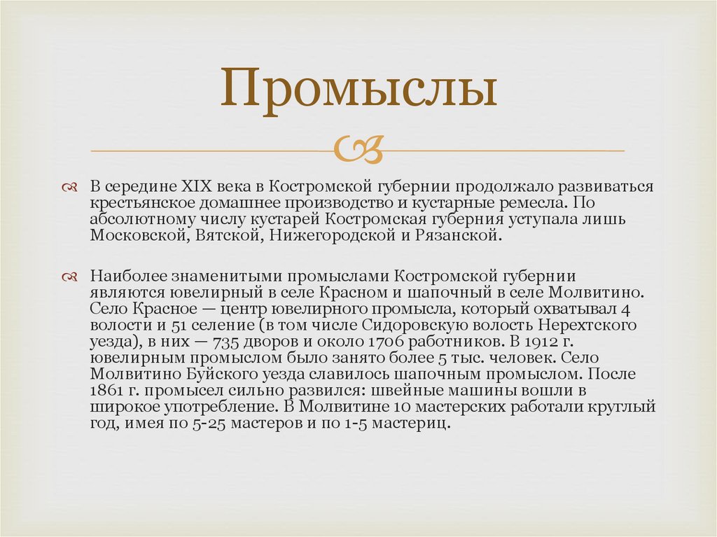 ПромыслыВ середине XIX века в Костромской губернии продолжало развиваться