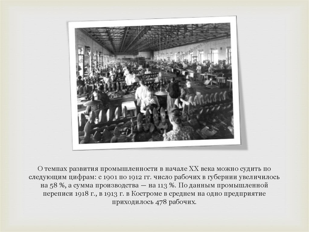 О темпах развития промышленности в начале XX века можно судить последующим цифрам: c 1901 по 1912 гг. число рабочих в губернии увеличилось