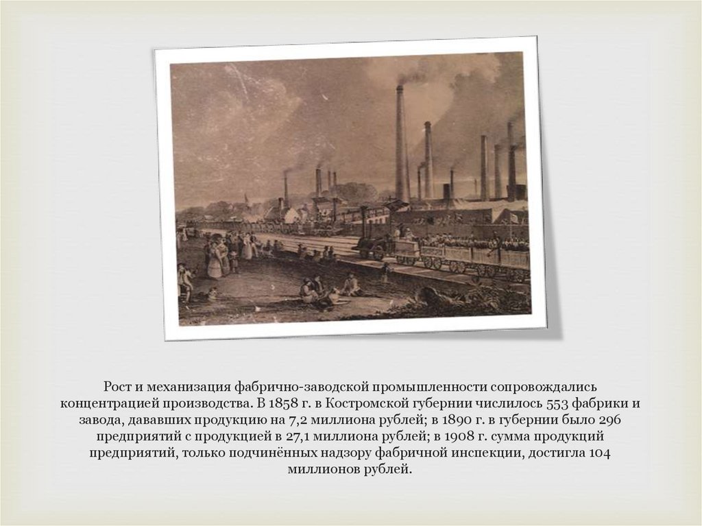 Рост и механизация фабрично-заводской промышленности сопровождалиськонцентрацией производства. В 1858 г. в Костромской губернии числилось 553 фабрики и