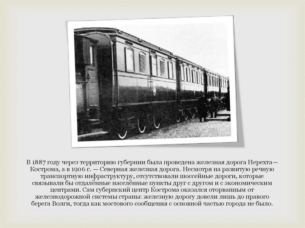 В 1887 году через территорию губернии была проведена железная дорога Нерехта—Кострома, а в 1906 г. — Северная железная дорога. Несмотря на развитую речную