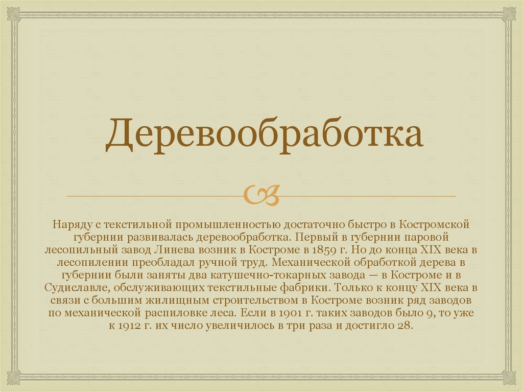 ДеревообработкаНаряду с текстильной промышленностью достаточно быстро в Костромской