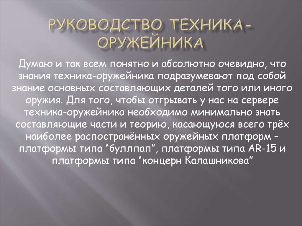 Думаю и так всем понятно и абсолютно очевидно, чтознания техника-оружейника подразумевают под собой