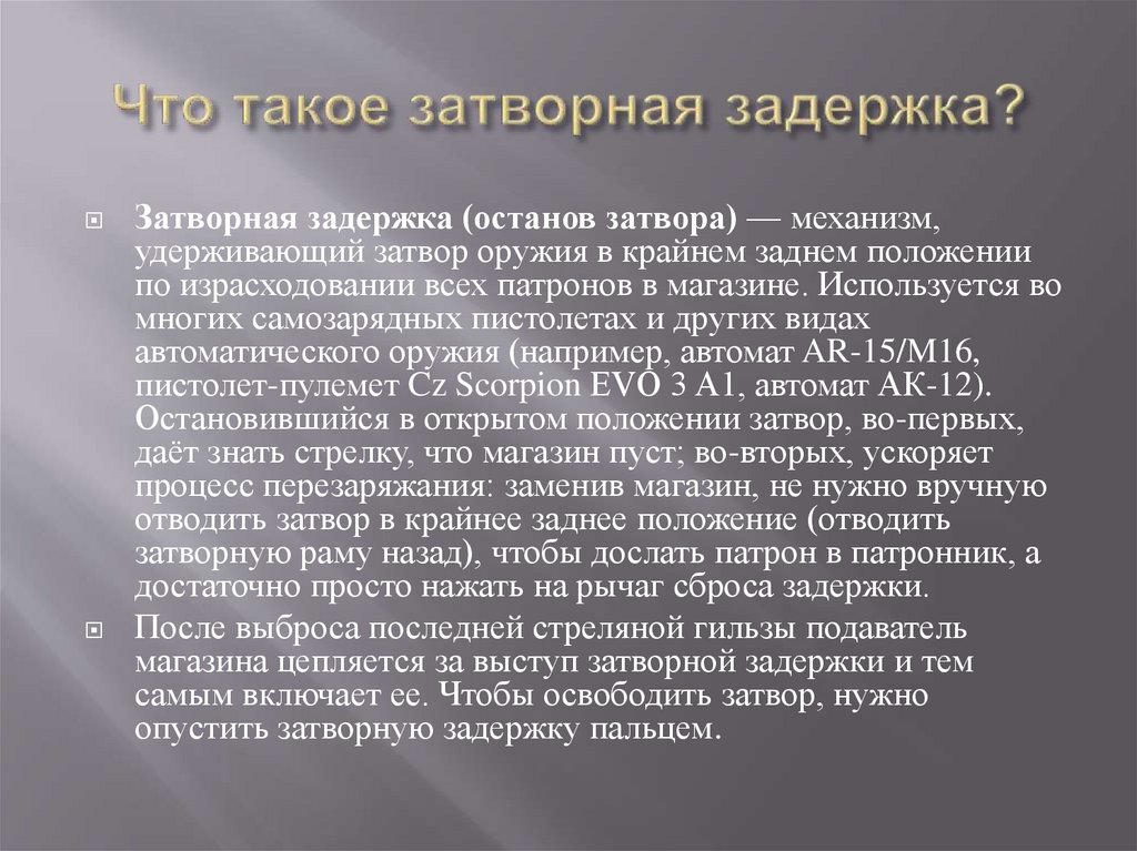 Затворная задержка (останов затвора) — механизм,удерживающий затвор оружия в крайнем заднем положении