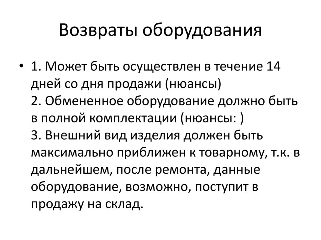 Возвраты оборудования• 1. Может быть осуществлен в течение 14