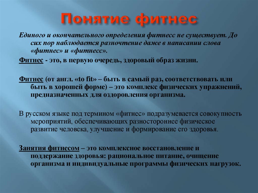 Единого и окончательного определения фитнесс не существует. Досих пор наблюдается разночтение даже в написании слова