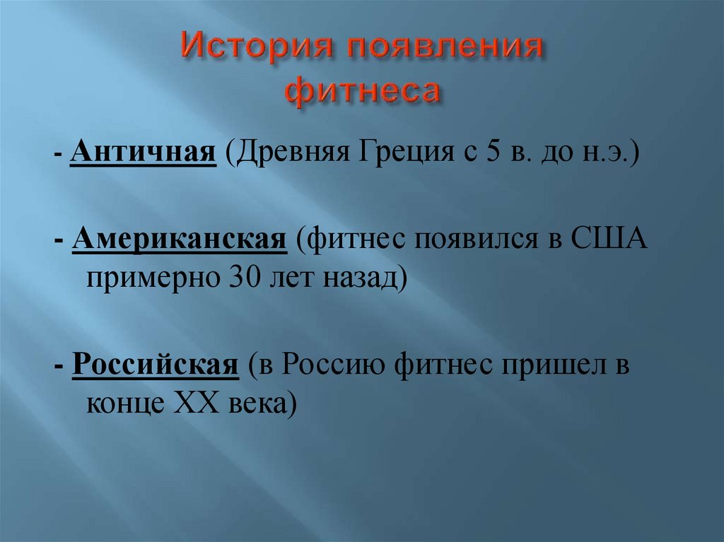 - Античная (Древняя Греция с 5 в. до н.э.)- Американская (фитнес появился в США
