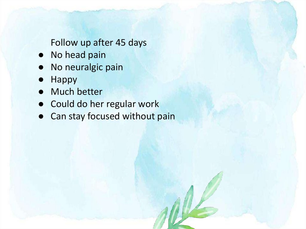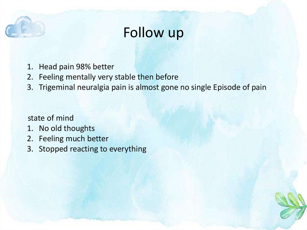 Follow up1. Head pain 98% better