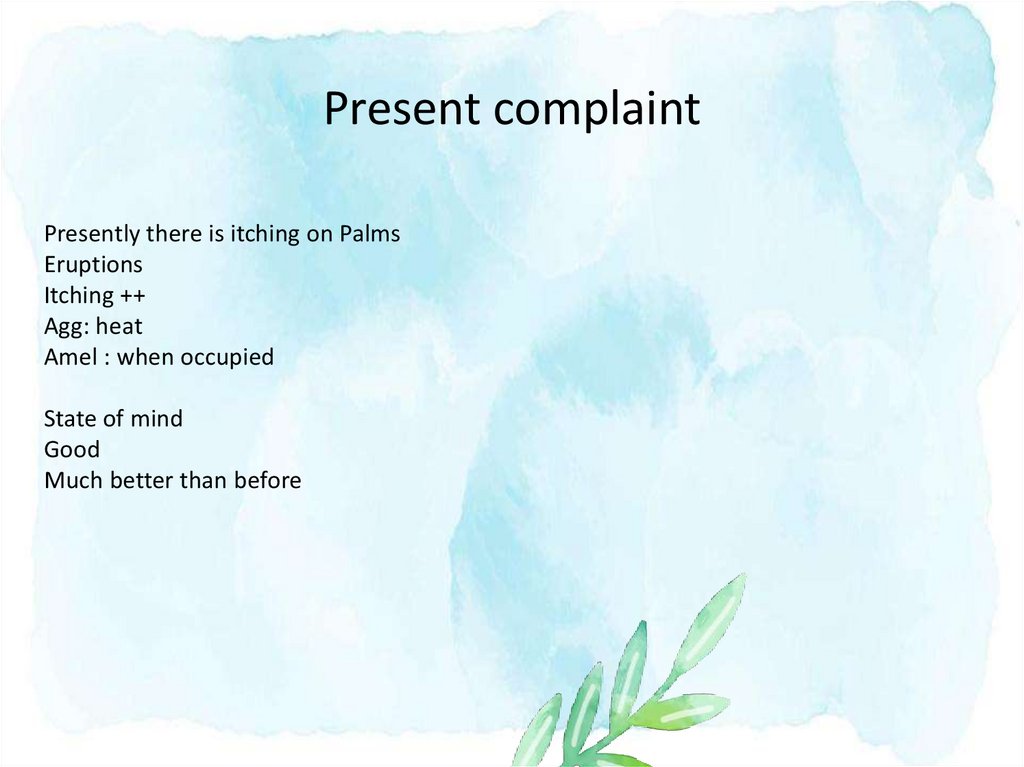 Present complaintPresently there is itching on Palms