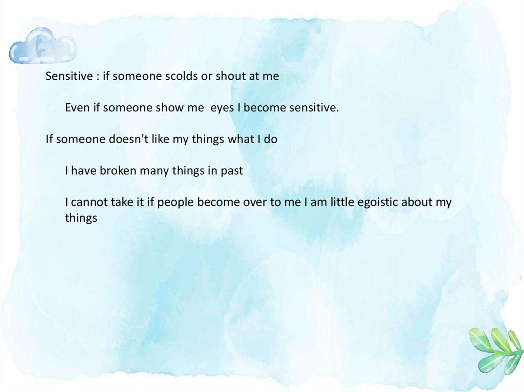 Sensitive : if someone scolds or shout at meEven if someone show me eyes I become sensitive.