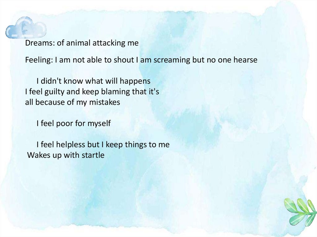 Dreams: of animal attacking meFeeling: I am not able to shout I am screaming but no one hearse