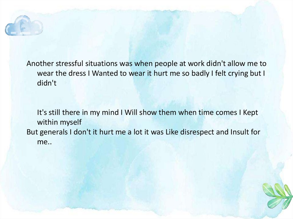 Another stressful situations was when people at work didn't allow me towear the dress I Wanted to wear it hurt me so badly I felt crying but I