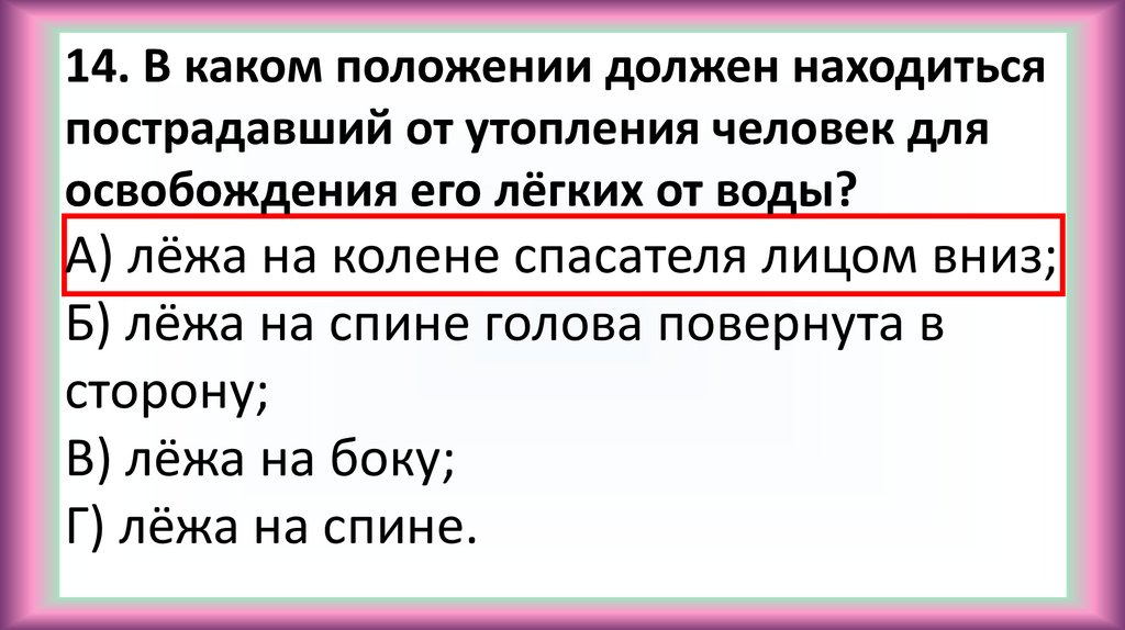 14. В каком положении должен находитьсяпострадавший от утопления человек для