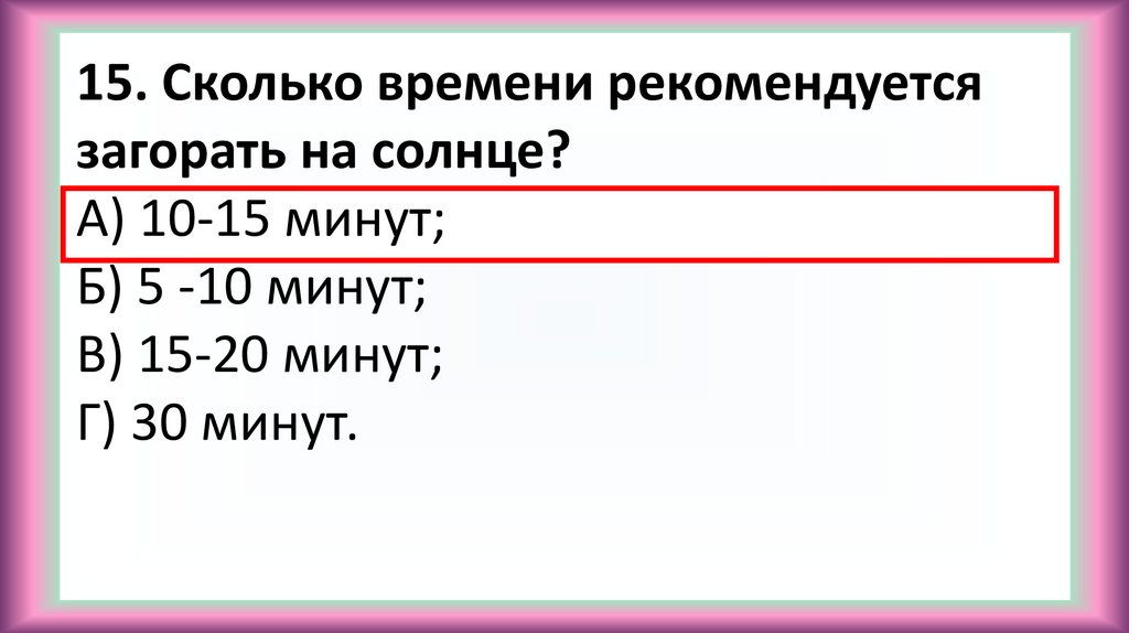 15. Сколько времени рекомендуетсязагорать на солнце?