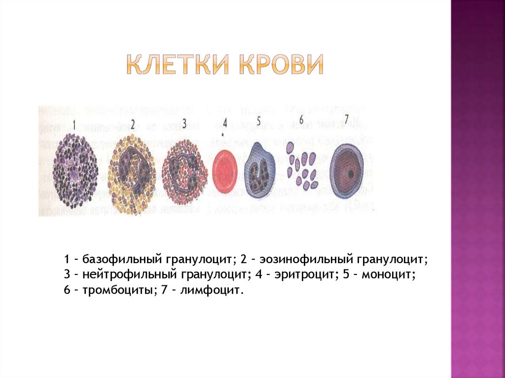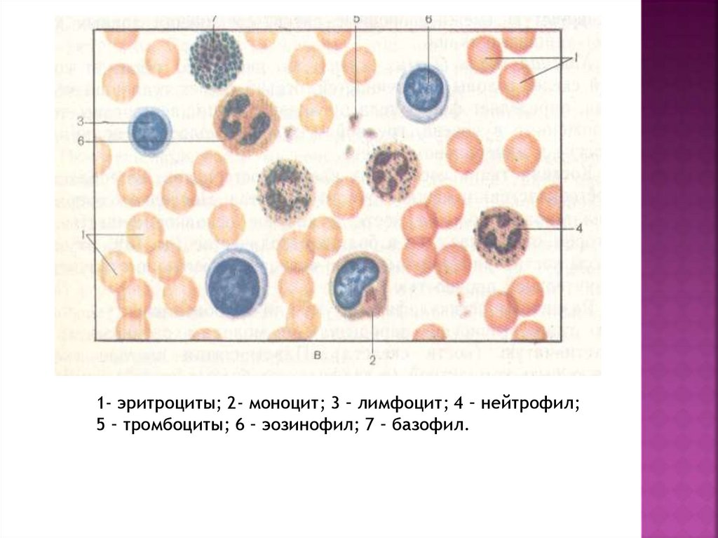 1- эритроциты; 2- моноцит; 3 – лимфоцит; 4 – нейтрофил;5 – тромбоциты; 6 – эозинофил; 7 – базофил.