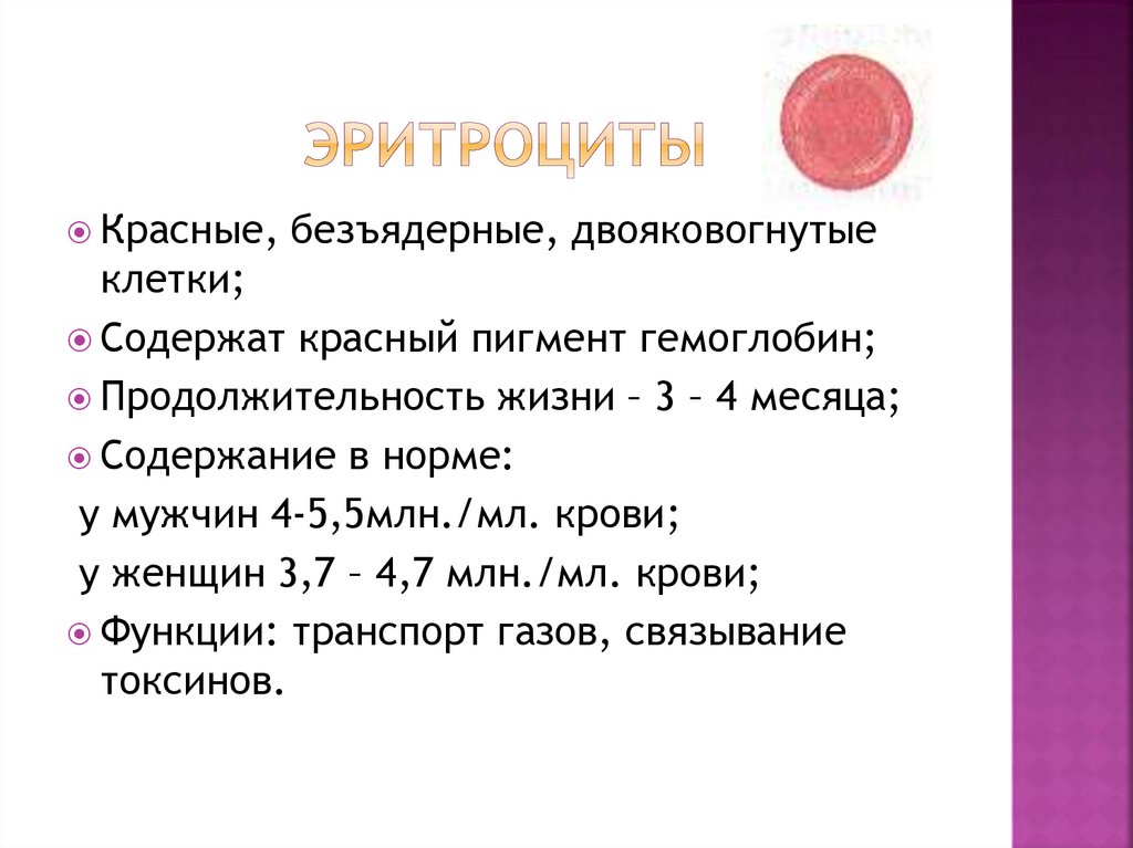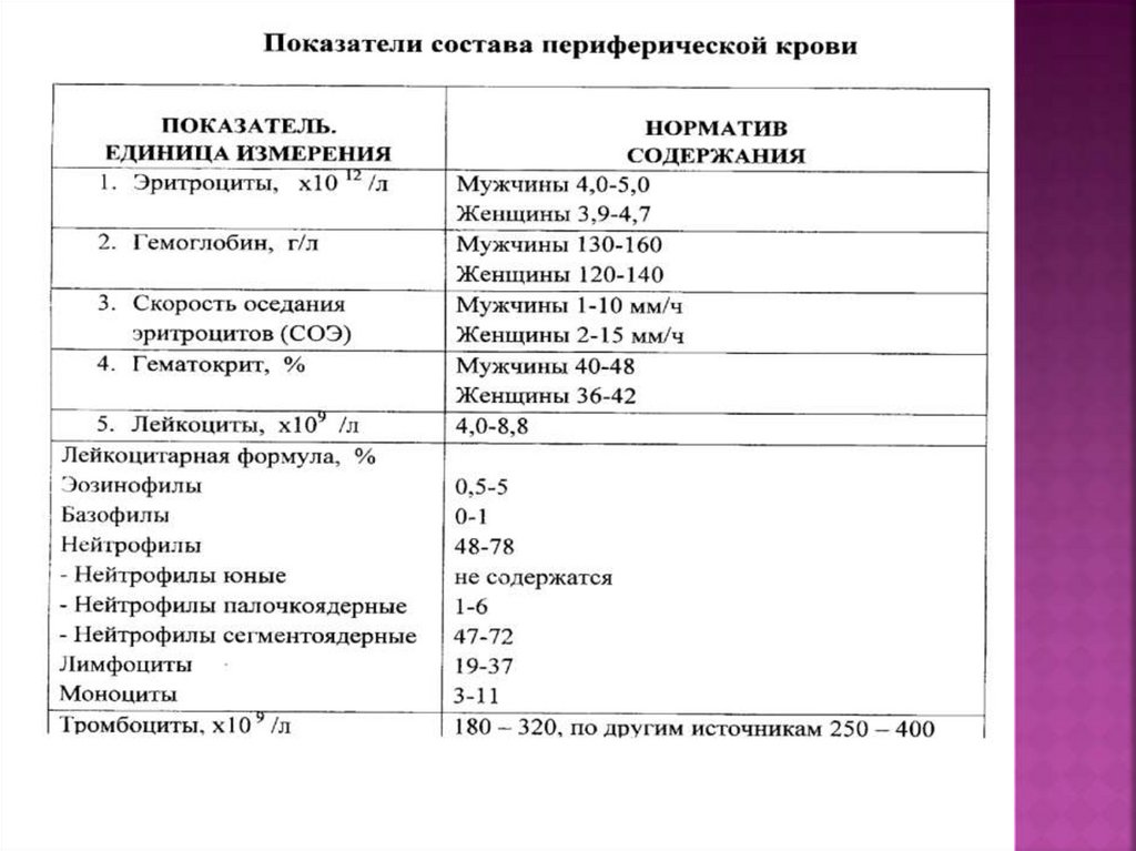 Содержание 180 – 400 тыс. /мл. крови;