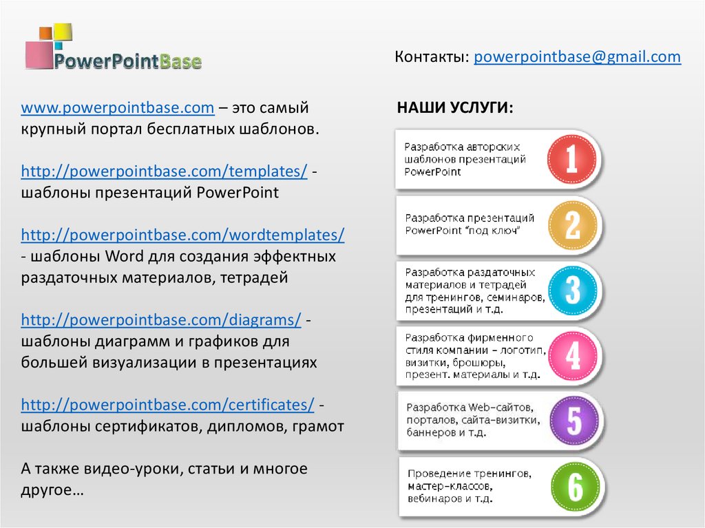 Контакты: powerpointbase@gmail.comwww.powerpointbase.com – это самый