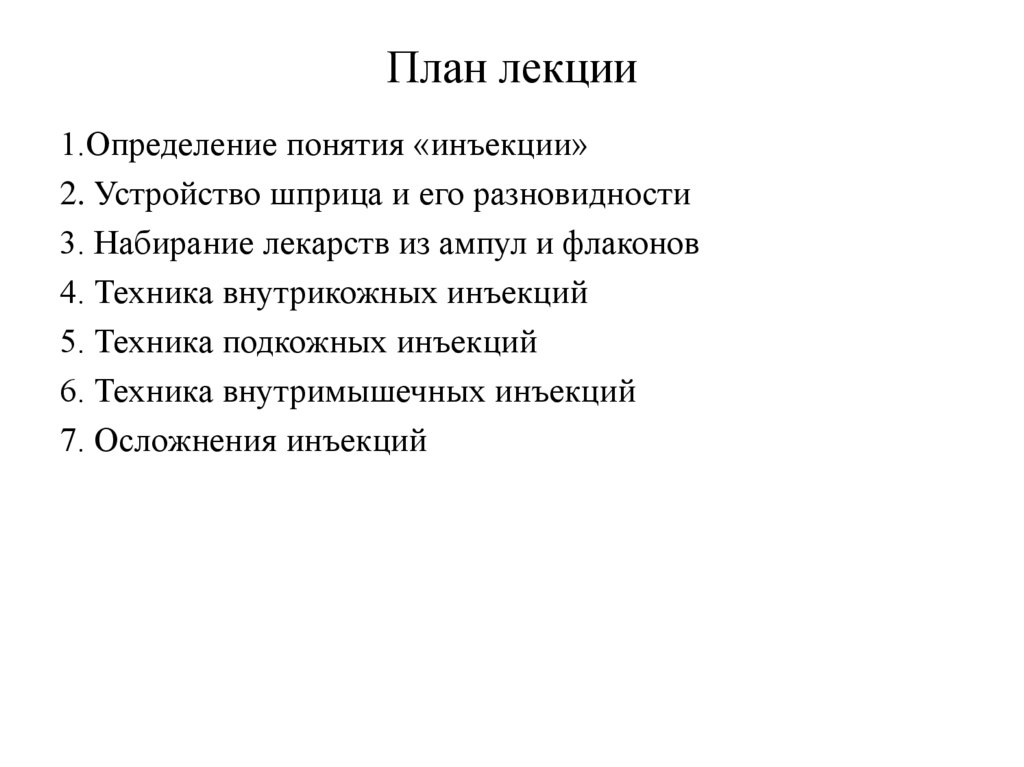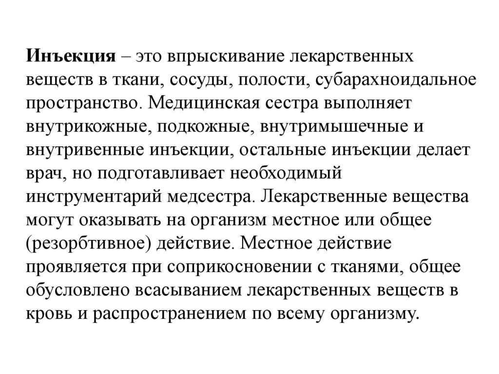 Инъекция – это впрыскивание лекарственныхвеществ в ткани, сосуды, полости, субарахноидальное