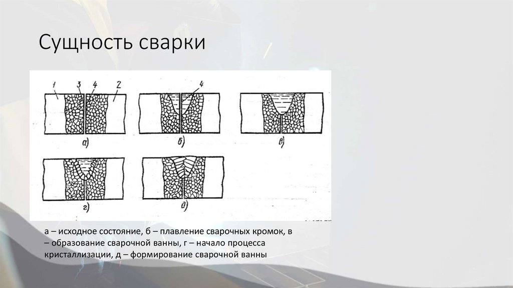Сущность сваркиа – исходное состояние, б – плавление сварочных кромок, в