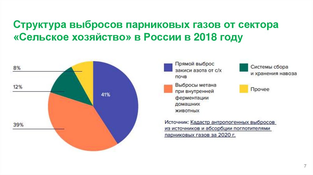 Структура выбросов парниковых газов от сектора«Сельское хозяйство» в России в 2018 году
