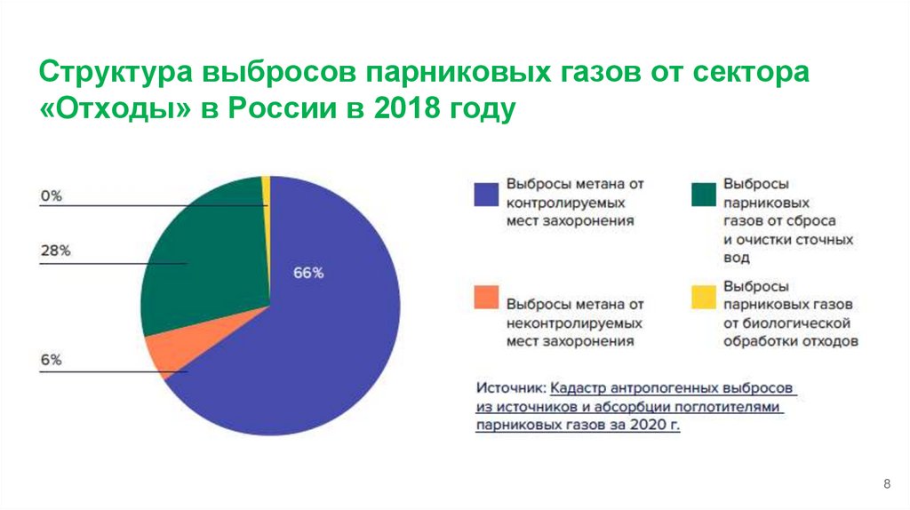 Структура выбросов парниковых газов от сектора«Отходы» в России в 2018 году
