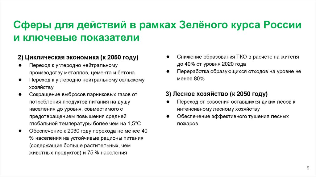 Сферы для действий в рамках Зелёного курса Россиии ключевые показатели