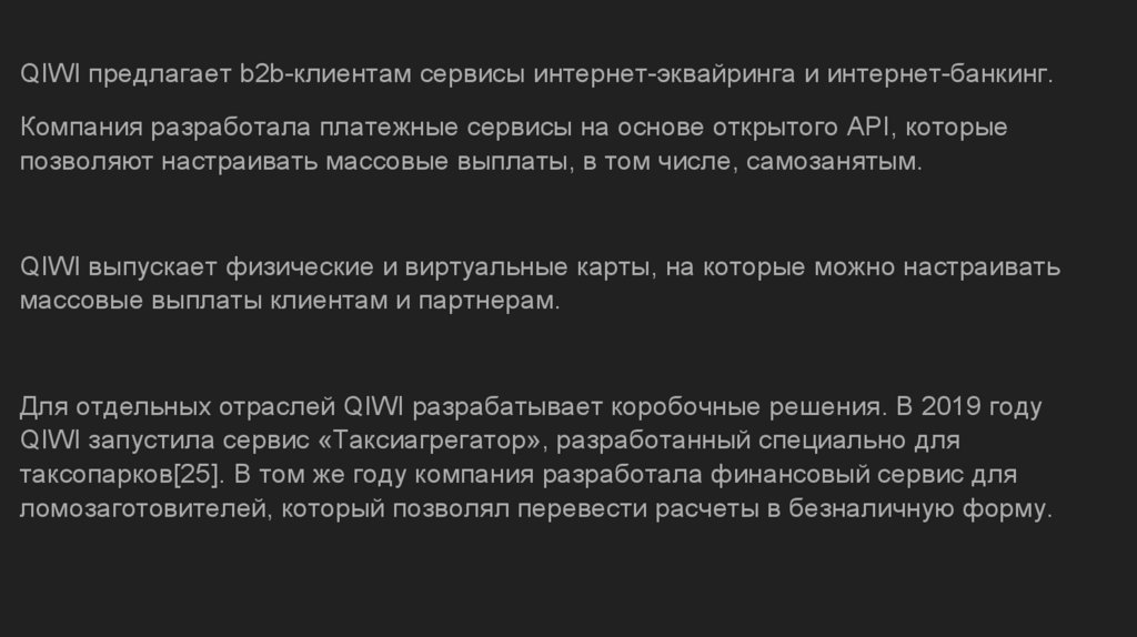 QIWI предлагает b2b-клиентам сервисы интернет-эквайринга и интернет-банкинг.Компания разработала платежные сервисы на основе открытого API, которые