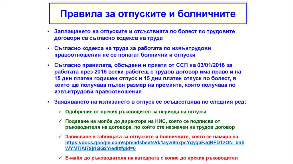 Правила за отпуските и болничните• Заплащането на отпуските и отсъствията по болест по трудовите