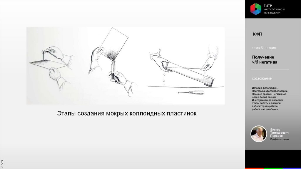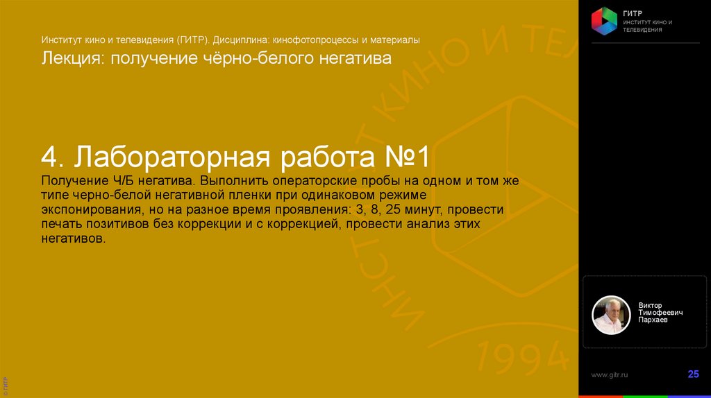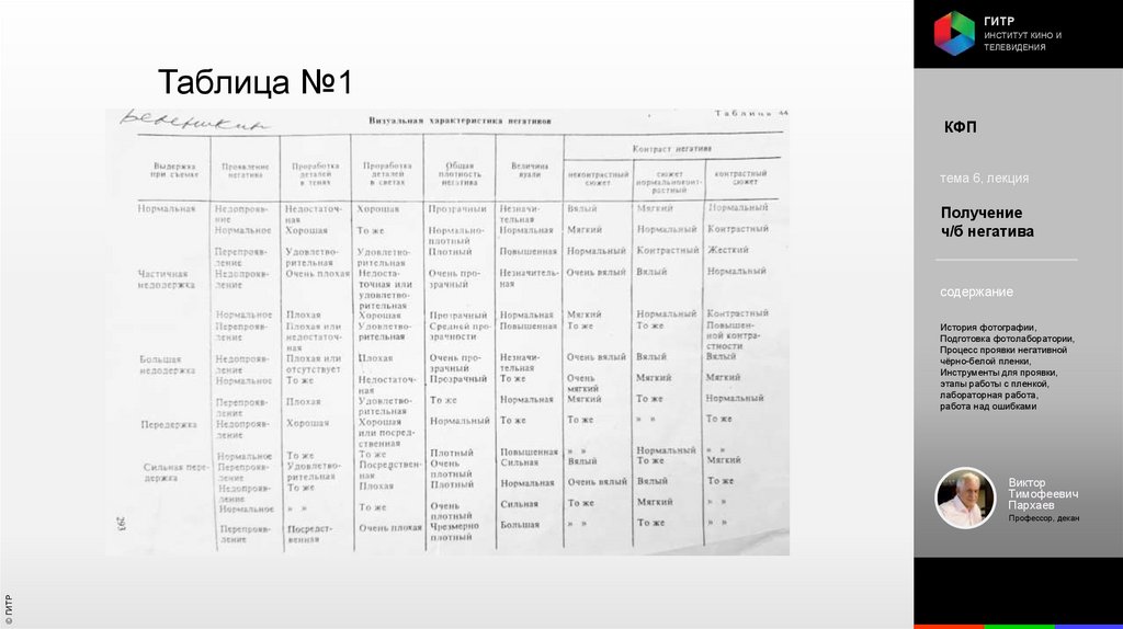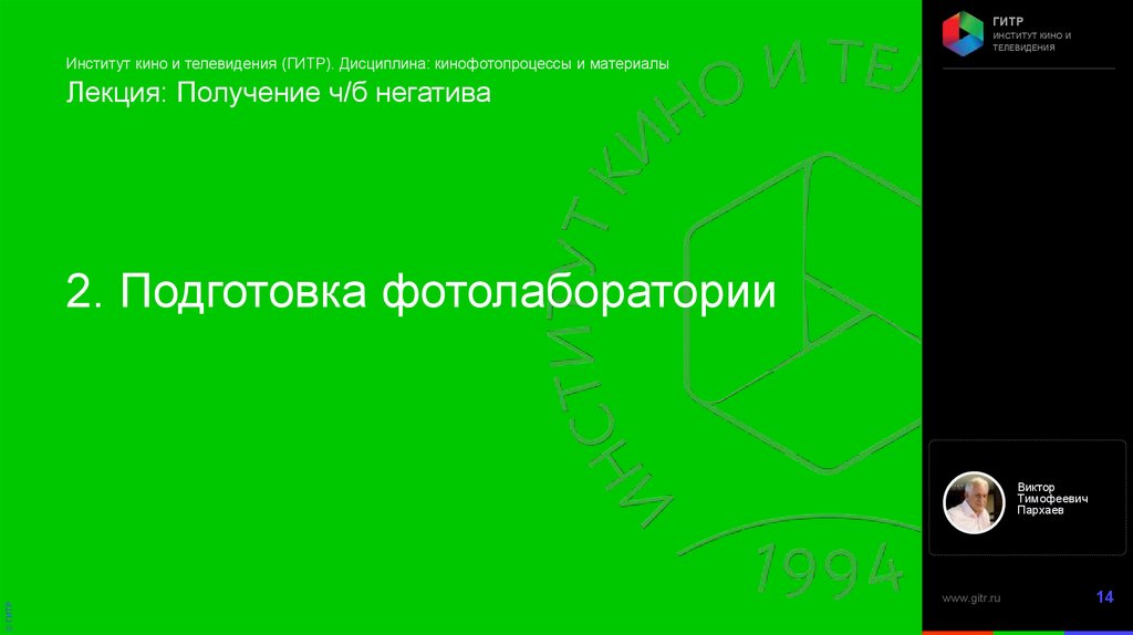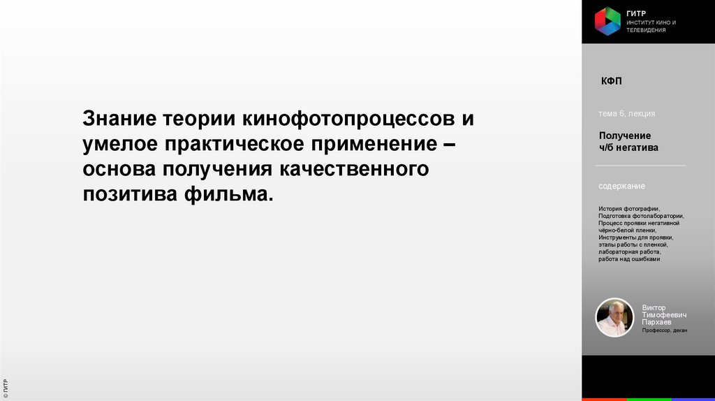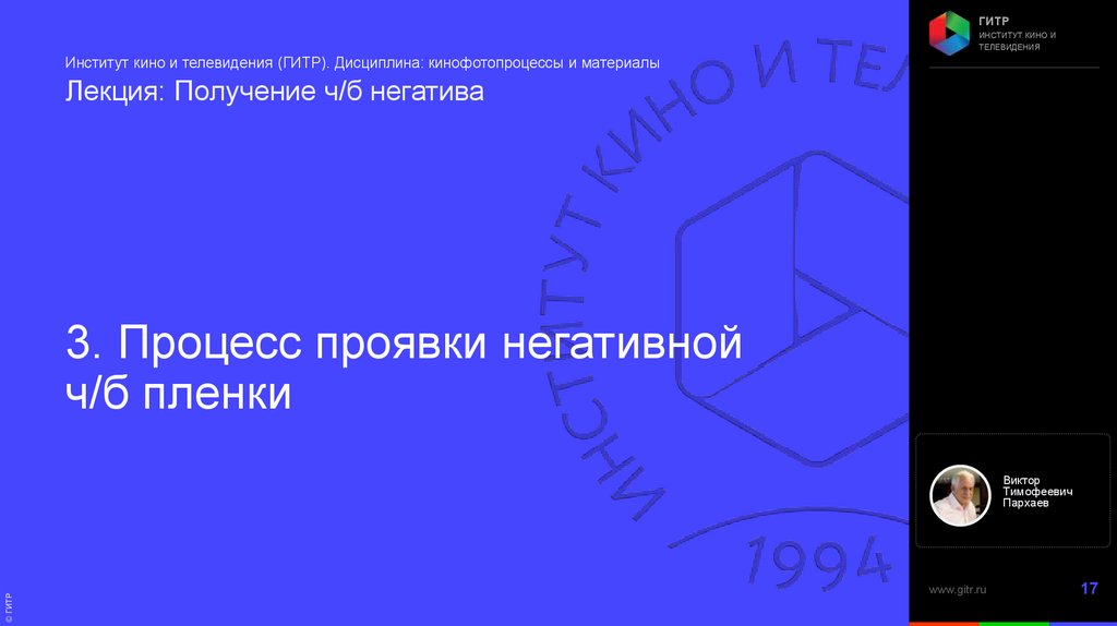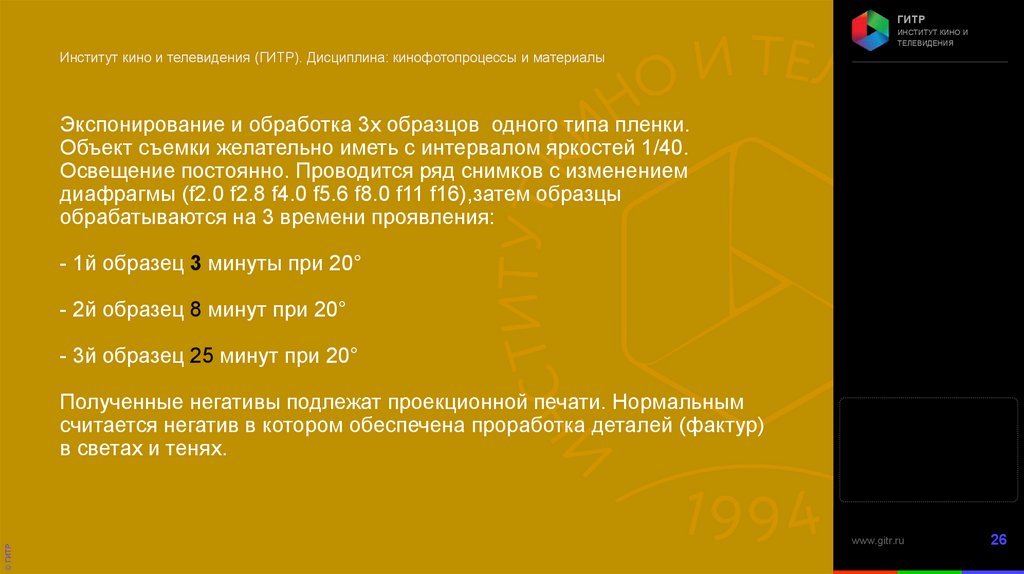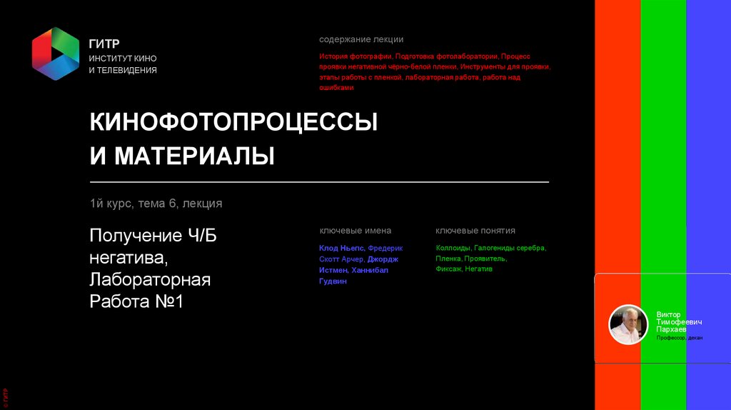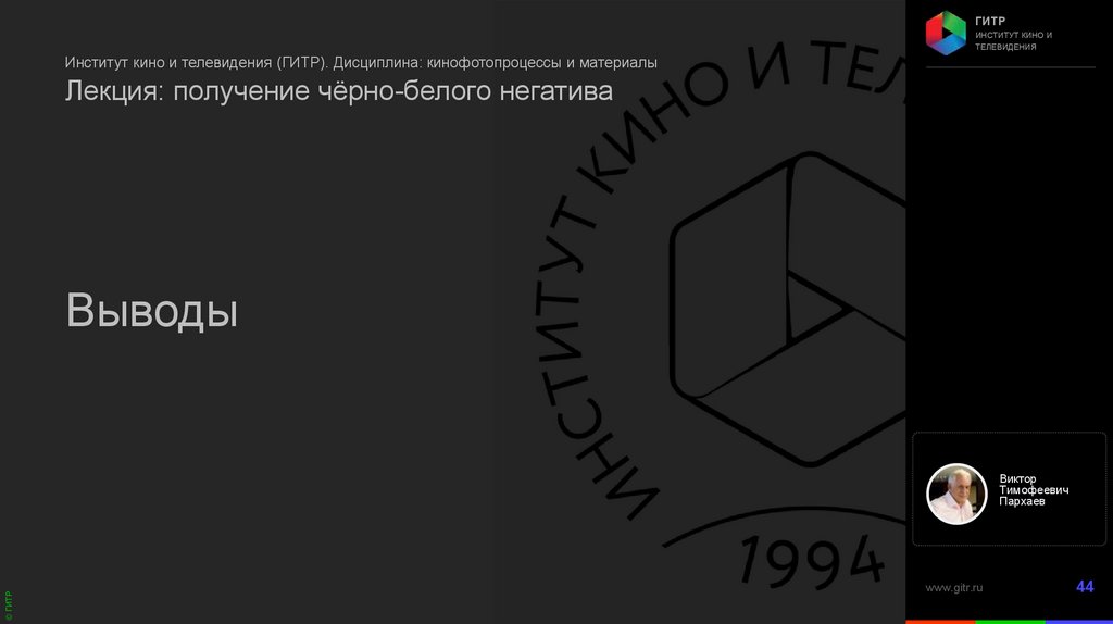 Институт кино и телевидения (ГИТР). Дисциплина: Кинофотопроцессы и материалы