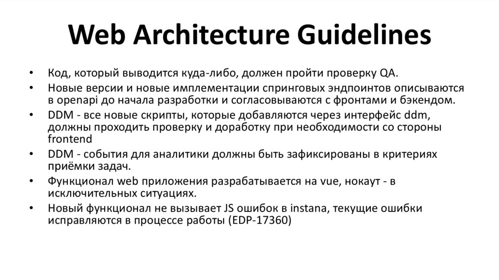 Web Architecture GuidelinesКод, который выводится куда-либо, должен пройти проверку QA.