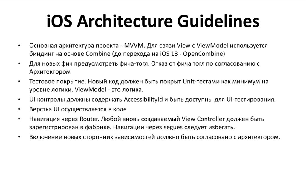 iOS Architecture GuidelinesОсновная архитектура проекта - MVVM. Для связи View c ViewModel используется