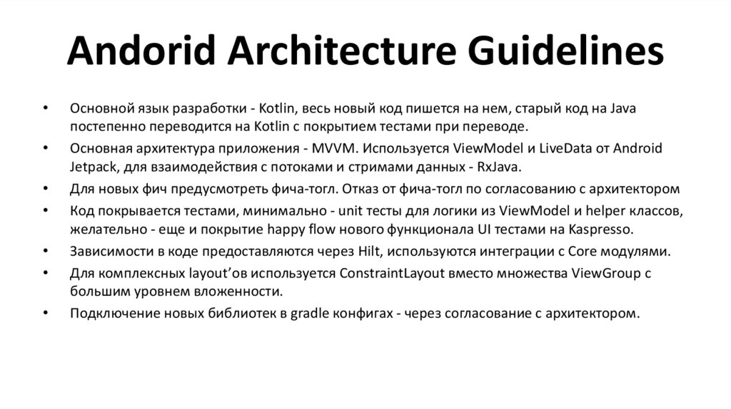Andorid Architecture GuidelinesОсновной язык разработки - Kotlin, весь новый код пишется на нем, старый код на Java