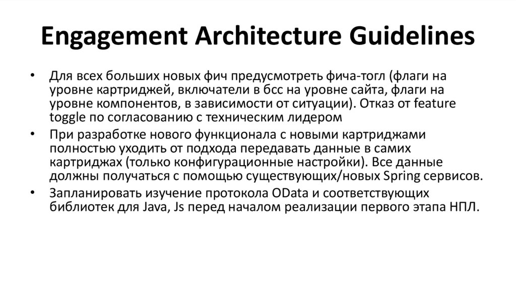 Engagement Architecture Guidelines• Для всех больших новых фич предусмотреть фича-тогл (флаги на