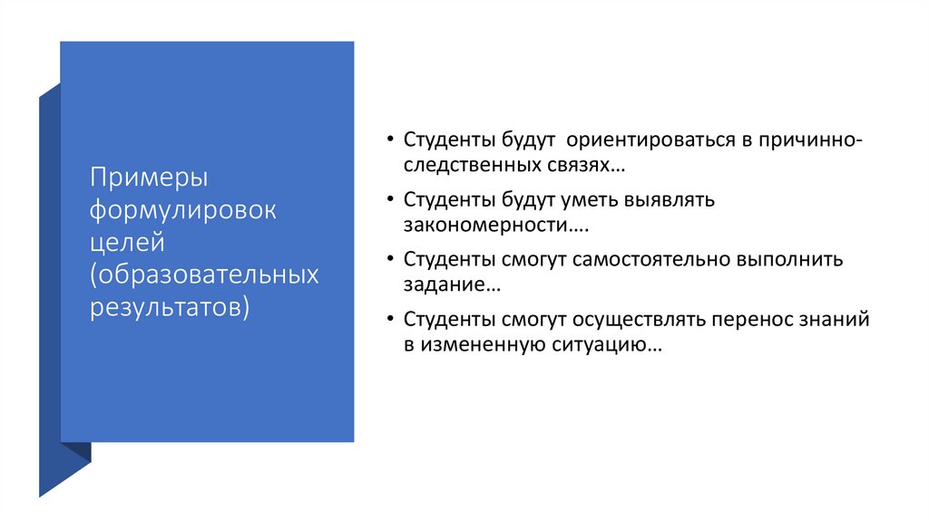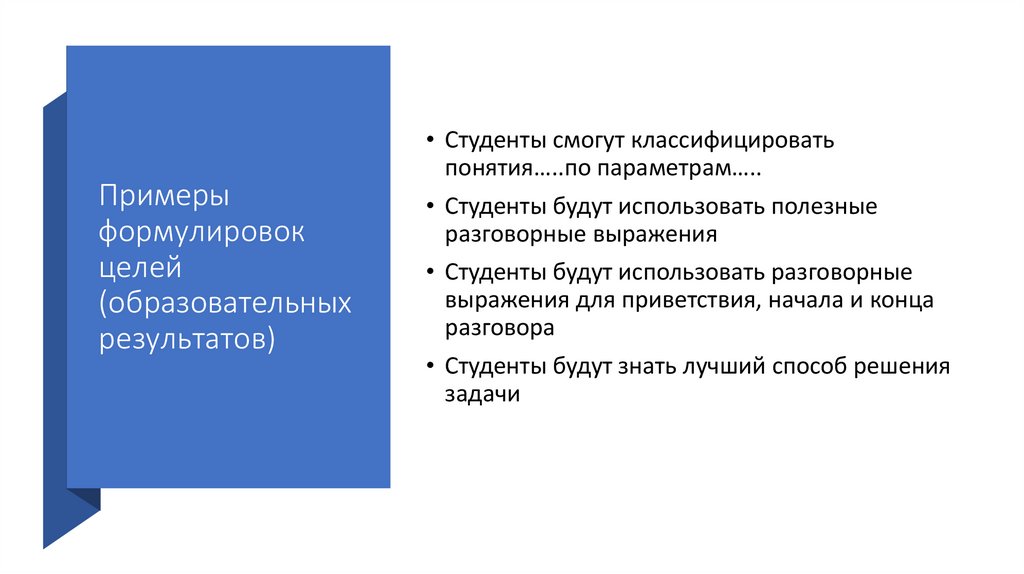 • Формулирование цели «языком» процесса обучения, а не результата: