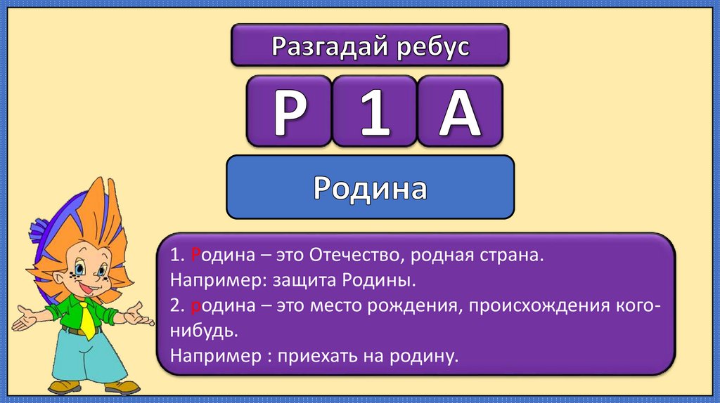 1. Родина – это Отечество, родная страна.Например: защита Родины.