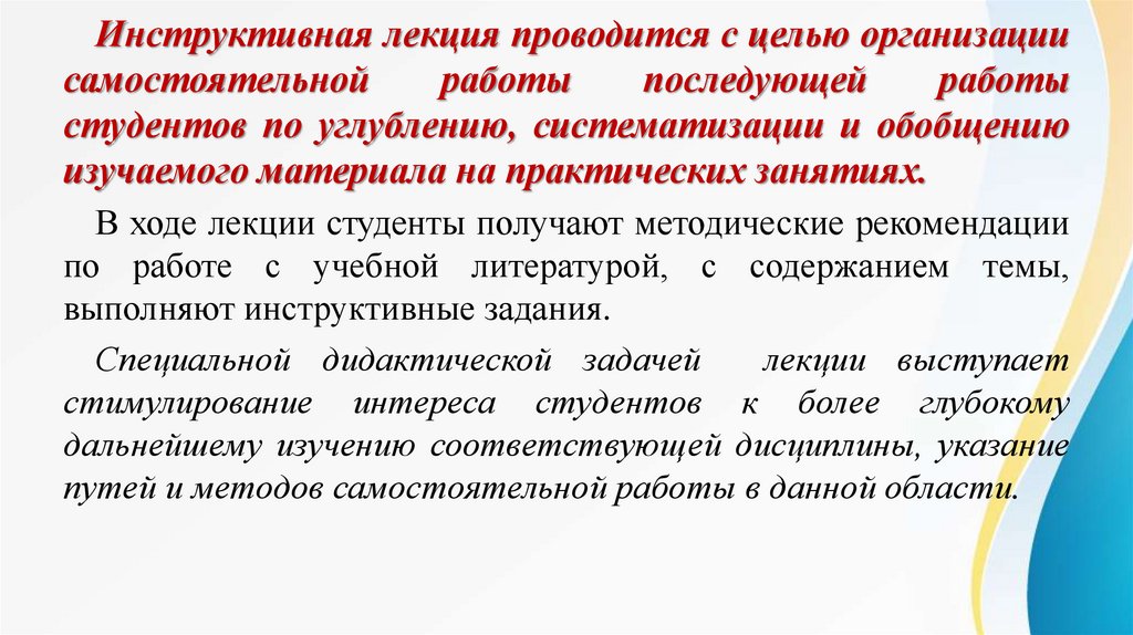 Инструктивная лекция проводится с целью организациисамостоятельной