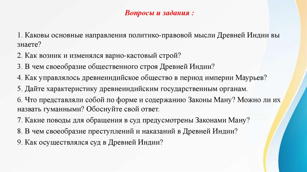 Вопросы и задания :1. Каковы основные направления политико-правовой мысли Древней Индии вы