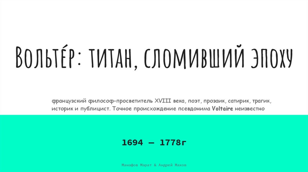 Вольтéр: титан, сломивший эпохуфранцузский философ-просветитель XVIII века, поэт, прозаик, сатирик, трагик,